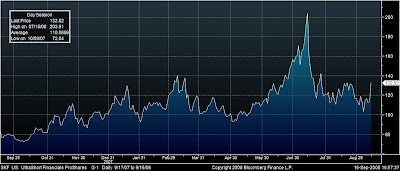 As for the Fed, I would be surprised, but not shocked, if we saw the Fed move 50bps today, however they will almost certainly switch to an easing bias in the statement and very likely modify and extend some of the current lending schemes (i.e. changes to the discount window and/or TAF, accepting more assets as collateral, possibly even allowing the Fed funds rate to trade well below target over the next couple of weeks, etc…). I don’t really believe a rate cut would be the right course of action, liquidity is the issue not price. However, psychologically it may help the market. All in all the Fed’s announcement will likely bring some calm to the market, which could easily be undone by an AIG collapse. We will all get a much better idea within the next 24 hours, as it has been reported an AIG deal would need to be completed by Wednesday. Currently, I am staying on the sidelines, but monitoring the situation closely. Finally, I did notice that the financial sector ultrashort ETF is trading nowhere near its July highs, which I found somewhat interesting. I am not very familiar with this fund, so if anyone has some insight on this please feel free to email me.